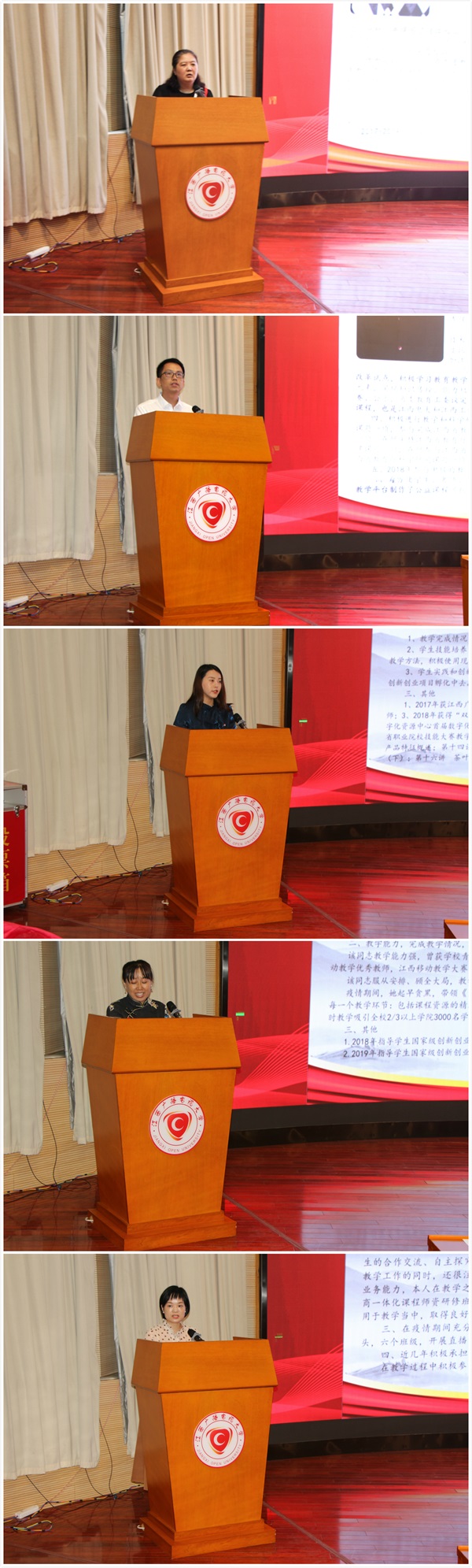 朱蕾、汪一心、陈亚薇、曾琼芳、王娟娟五位“优秀教师年度人物”代表立足自身工作实际,结合自身工作经历,围绕“立德树人奋进担当,教育脱贫托举希望”这一主题,饱含深情地讲述了各自的教书育人故事,生动展示了电大教师阳光美丽、爱岗敬业、无私奉献的良好形象,引导全省电大系统教职员工厚植爱国主义情怀,坚守立德树人使命,努力培养担当民族复兴大任的时代新人。