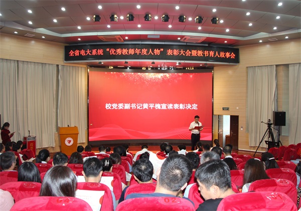 表彰大会暨教书育人故事会在隆重庄严的《中华人民共和国国歌》声中拉开帷幕,参会代表全体起立奏唱国歌。黄平槐宣读2020年全省电大系统“优秀教师年度人物”表彰决定。朱爱莹为受表彰的“优秀教师年度人物”颁发荣誉证书。