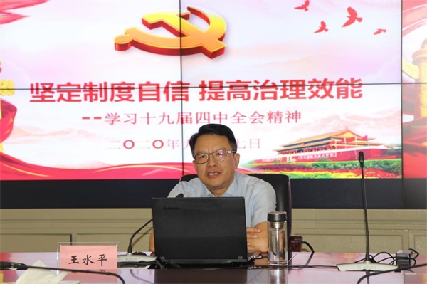 王水平从党的十九届四中全会召开的时代背景和重大意义,中国特色社会主义制度和国家治理体系的显著优势,坚持和完善中国特色社会主义制度、推进国家治理体系和治理能力现代化的主要任务,深入贯彻落实党的十九届四中全会精神、推进学校各项事业高质量发展等四个方面对十九届四中全会精神进行了详尽解读,并将理论与实际紧密结合,阐释了全会精神对学校工作高质量发展的指导意义。