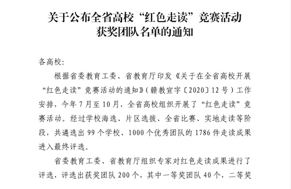 1119日,江西省教育厅公布了全省高校“红色走读”竞赛活动获奖团队名单,由我校高职学院杨近铬、李汉平、汪荣林、陈蔓茜、何海霞老师指导的“信仰的味道”团队和杨近铬、李汉平、汪荣林、魏国方老师指导的“红色之星”团队荣获二等奖。