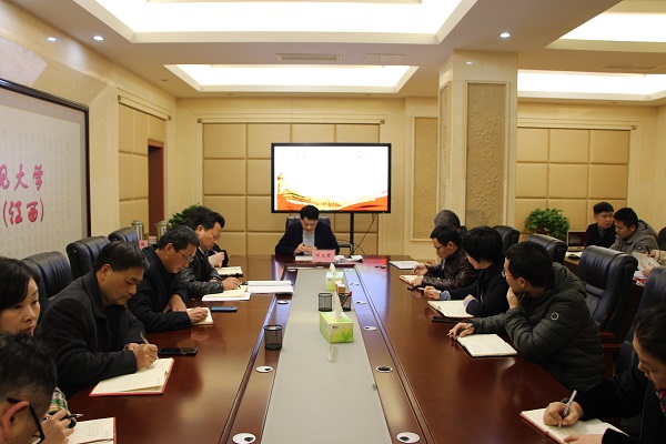 127日下午,校党委副书记邓文君在行政楼三楼第一会议室主持召开宣讲会,宣讲党的十九届五中全会精神。党委办公室、校长办公室,党委组织部,党委宣传部,党委统战部,党校(机关党委),人事处,工会,团委,学生工作部(处)、招生工作处,学报编辑部,思想政治理论课教学部主要负责同志及各部门(单位)全体党员干部、入党积极分子认真聆听了宣讲。