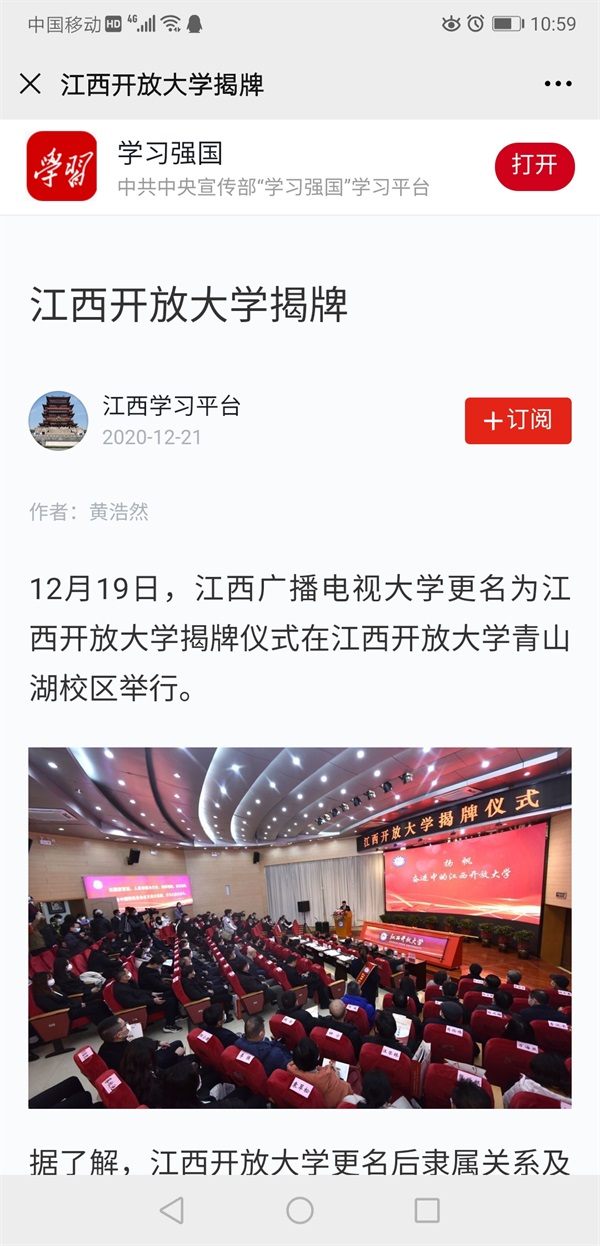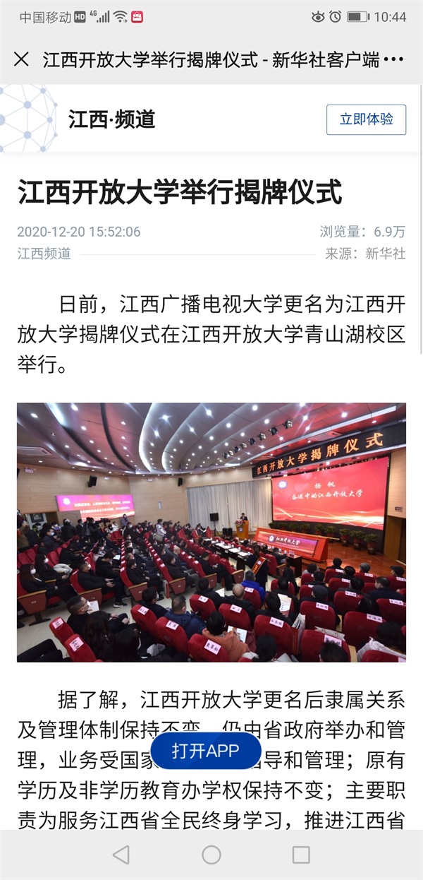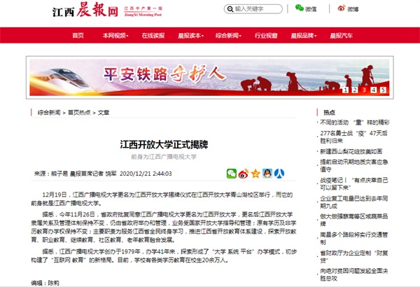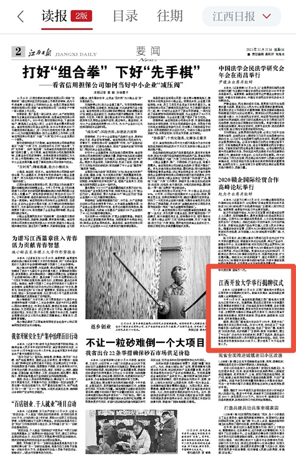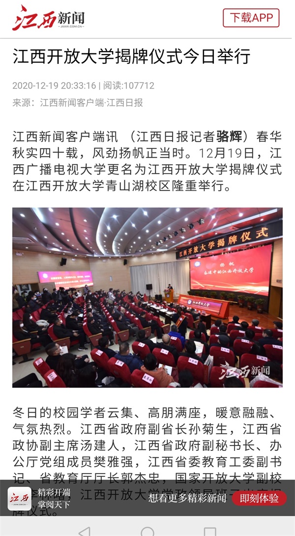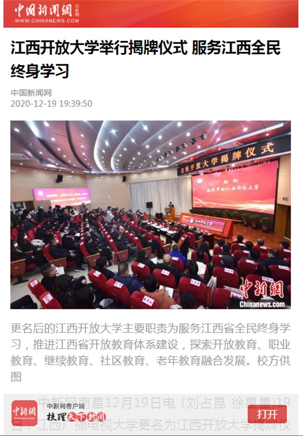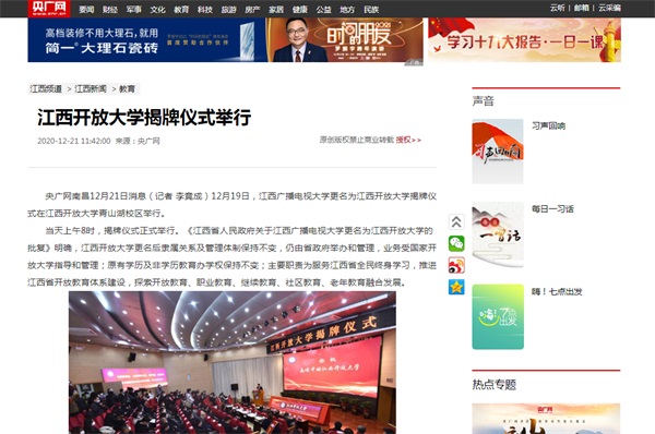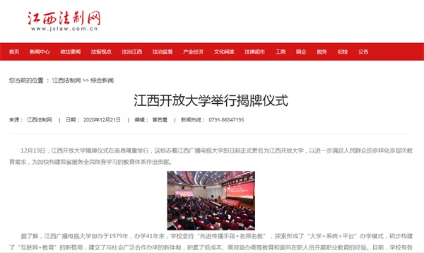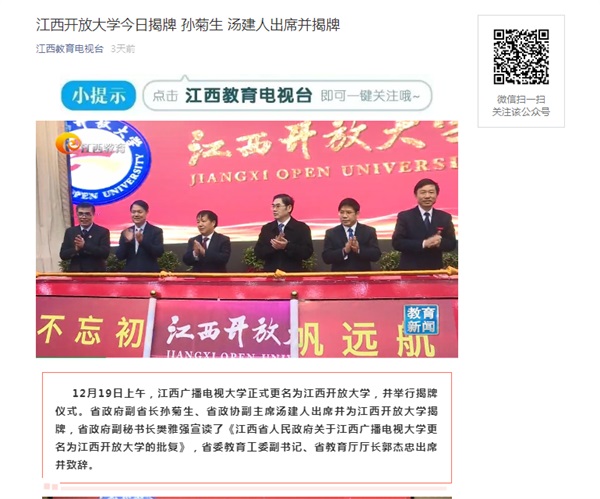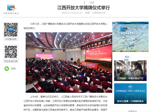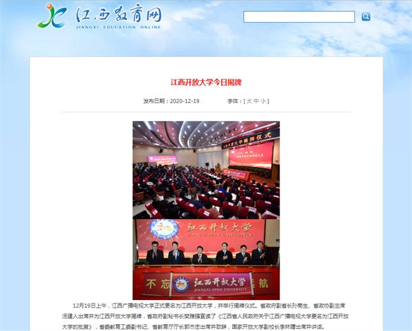 在决胜收官与谋划新局的关键之年,江西省人民政府批准江西广播电视大学更名为澳门威威尼斯8040,实现了全省电大人的夙愿。12月19日-21日,江西日报、“学习强国”学习平台、新华社、人民网等多家主流媒体相继报道澳门威威尼斯8040更名盛况。