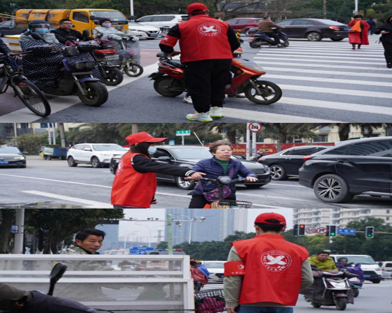 高职学院学生会青年志愿者们利用周末时间前往学校周边的路口,协助交警开展文明交通劝导志愿服务,把违停的自行车摆放整齐,引导行人过斑马线,及时制止行人乱穿马路、乱闯红灯,维护交通秩序,呼吁文明出行。