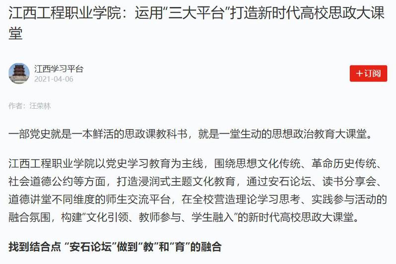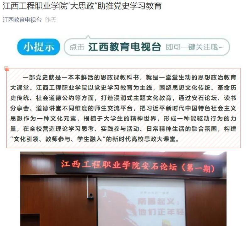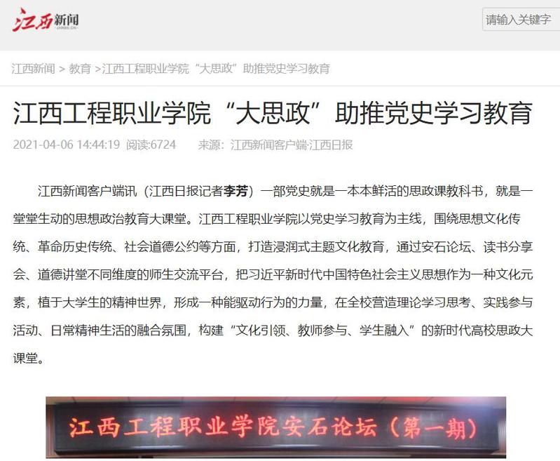 一部党史就是一本本鲜活的思政课教科书,就是一堂堂生动的思想政治教育大课堂。近期,学校高职学院通过安石论坛、读书分享会、道德讲堂不同维度的师生交流平台,打造浸润式主题文化教育,构建“文化引领、教师参与、学生融入”的新时代高校思政大课堂,助推党史学习教育。4月6日,新华社、学习强国、江西新闻客户端等多家媒体相继对此进行报道。