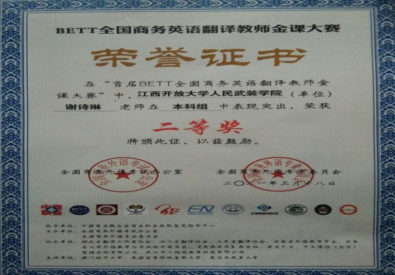 近期,2021年“首届BETT全国商务英语翻译教师金课大赛”公布获奖结果,我校人武学院外语系谢诗琳副教授荣获二等奖。此次金课大赛是在全面振兴教育,为建设具有高阶性、创新性、挑战度的中国大学“金课”、提高高校教育质量、培养高水平人才的背景下,由“全国商务外语考试办公室”和“全国商务外语专业委员会”携手多家企事业单位共同举办。(文字/图片:人武学院 责任编辑:徐星星)