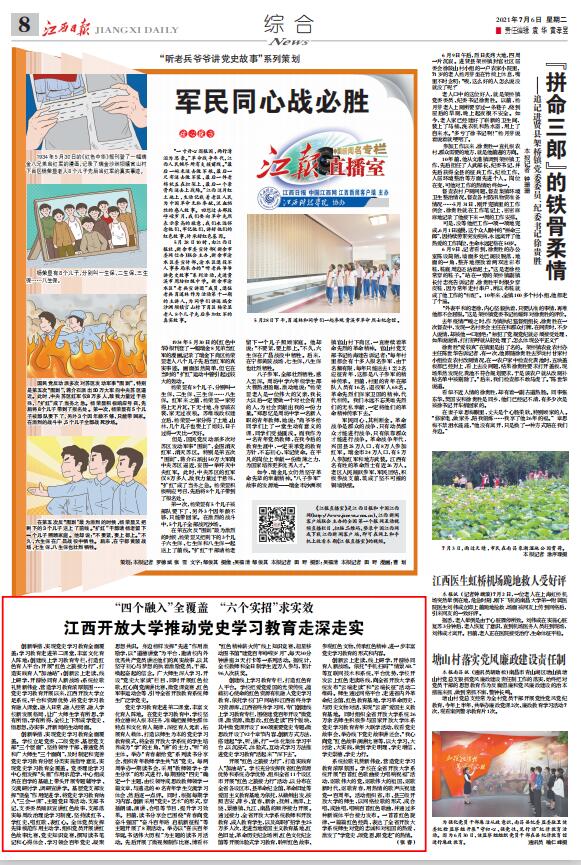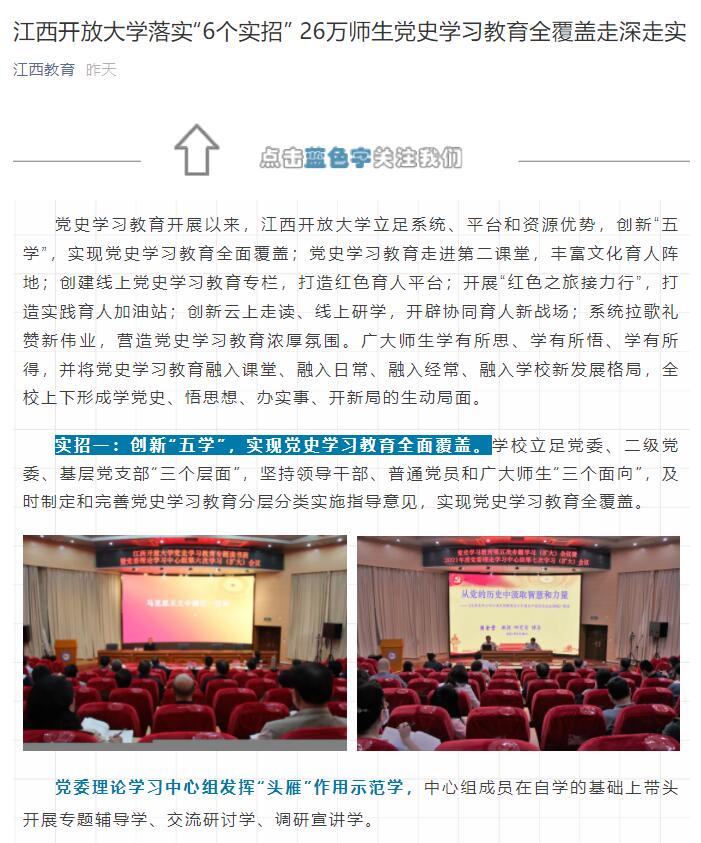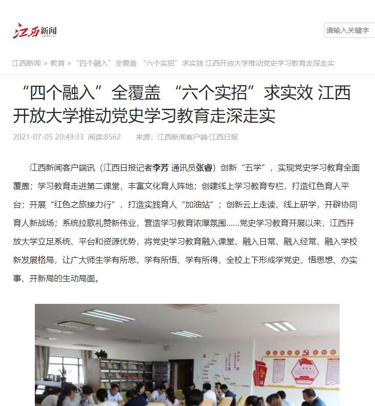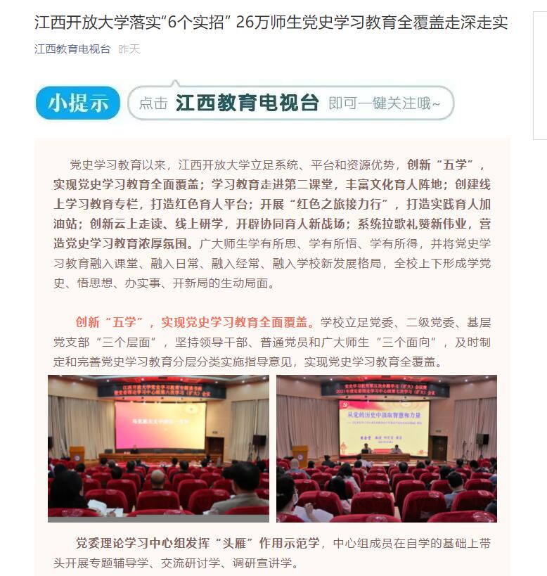 党史学习教育以来,澳门威威尼斯8040立足系统、平台和资源优势,创新“五学”,实现党史学习教育全面覆盖;学习教育走进第二课堂,丰富文化育人阵地;创建线上学习教育专栏,打造红色育人平台;开展“红色之旅接力行”,打造实践育人加油站;创新云上走读、线上研学,开辟协同育人新战场;系统拉歌礼赞新伟业,营造党史学习教育浓厚氛围。广大师生学有所思、学有所悟、学有所得,并将党史学习教育融入课堂、融入日常、融入经常、融入学校新发展格局,全校上下形成学党史、悟思想、办实事、开新局的生动局面。近日,江西日报、江西新闻、江西教育、江西教育电视台等媒体对此进行报道。