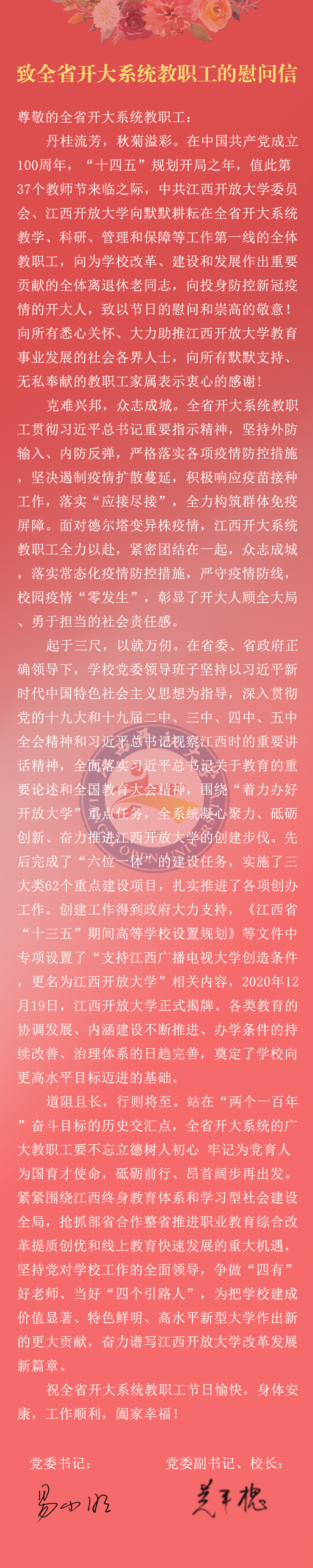 丹桂流芳,秋菊溢彩。在中国共产党成立100周年,“十四五”规划开局之年,值此第37个教师节来临之际,中共江西开放大学委员会、江西开放大学向默默耕耘在全省开大系统教学、科研、管理和保障等工作第一线的全体教职工,向为学校改革、建设和发展作出重要贡献的全体离退休老同志,向投身防控新冠疫情的开大人,致以节日的慰问和崇高的敬意!向所有悉心关怀、大力助推江西开放大学教育事业发展的社会各界人士,向所有默默支持、无私奉献的教职工家属表示衷心的感谢!