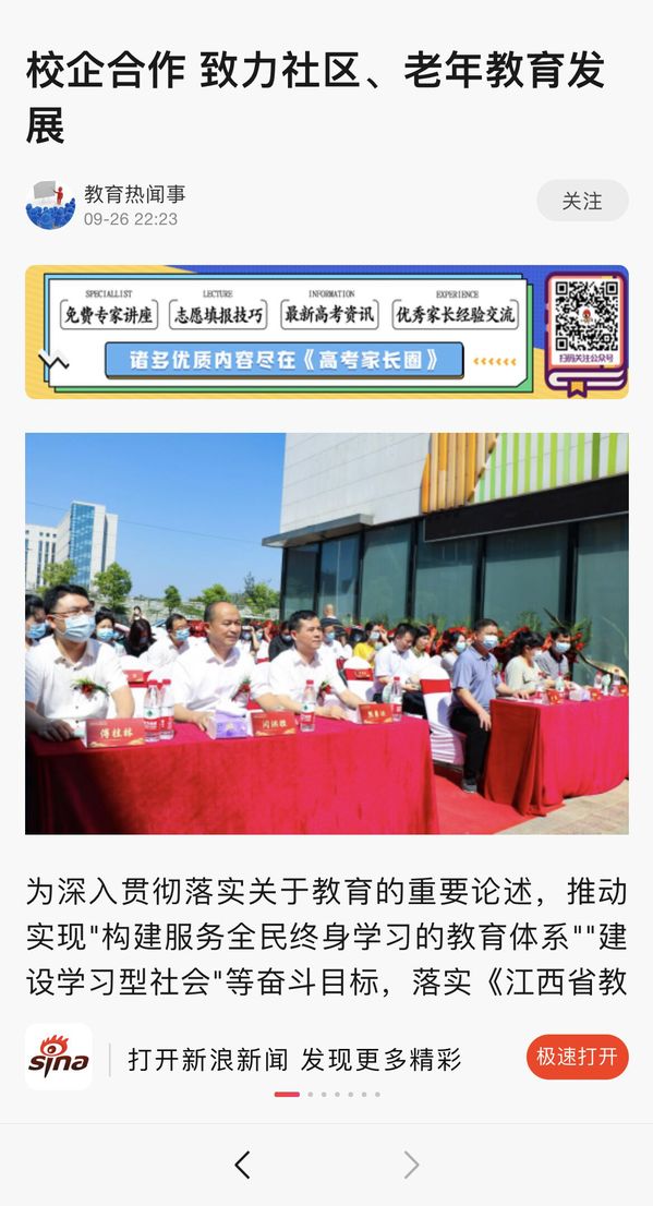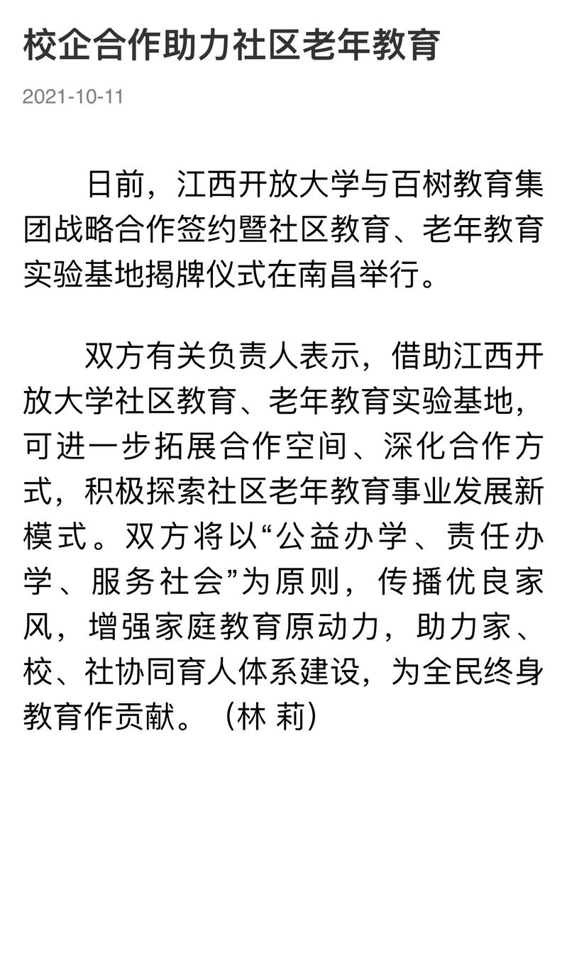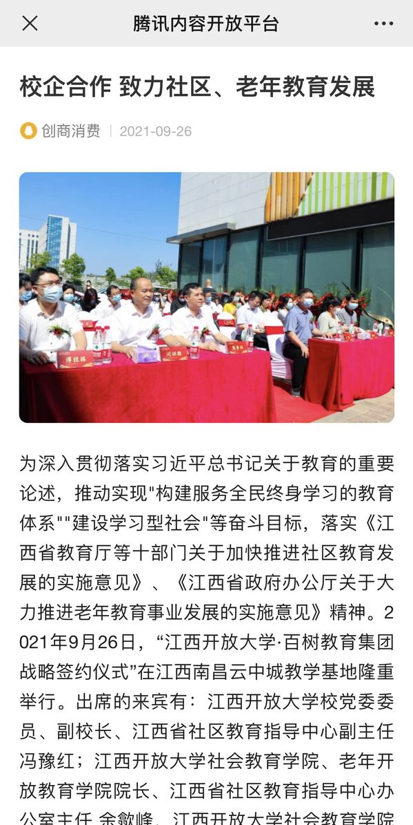 日前,澳门威威尼斯8040与百树教育集团战略合作签约暨社区教育、老年教育实验基地揭牌仪式在南昌举行。江西日报、大江网、江西新闻等多家媒体报道我校以校企合作助推社区老年教育。