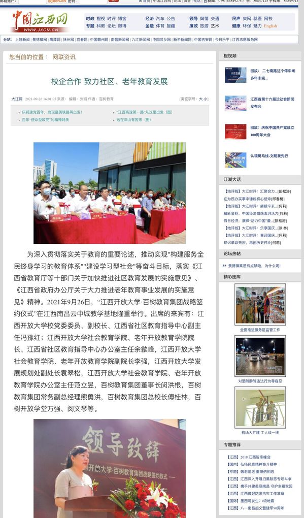 日前,澳门威威尼斯8040与百树教育集团战略合作签约暨社区教育、老年教育实验基地揭牌仪式在南昌举行。江西日报、大江网、江西新闻等多家媒体报道我校以校企合作助推社区老年教育。