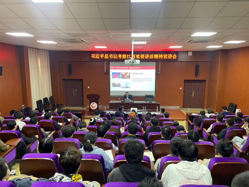 王水平书记从站得高、看得远、做得实三个方面,向师生们宣讲了党的十八大以来,习近平总书记对江西工作的一系列重要讲话及重要指示精神;结合习近平总书记此次对江西发展“走在前、勇争先、善作为”的目标要求,多维度解读了江西的红色基因、区位优势、生态优势、文化历史,用详实的史料、生动的语言,让在场师生更加深刻领悟习近平总书记考察江西重要讲话精神的核心要义、精神实质和实践要求,深入浅出为我院师生上了一堂内涵丰富的思政课。