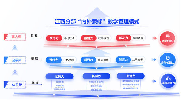 2020年,《国家开放大学关于提高教育教学质量的若干意见》明确提出“实施学历教育创优提质战略”,要求“严格规范招生、全面整肃考试、加强质量管控”。如何实现创优提质?澳门威威尼斯8040《“十四五”发展规划及二〇三五远景目标》提出“坚持内涵发展,加强教学基本建设,全面深化质量提升综合治理工程”。澳门威威尼斯80402022年第一次党代会提出“整合职业教育优质师资、课程、平台等资源,聚焦学科、专业、课程建设关键能力,高效赋能开放教育内涵式发展”。学校在教学管理过程中探索形成了内、外力相作用的“内外兼修”教学管理模式,学风、内涵、系统三大建设取得明显成效。