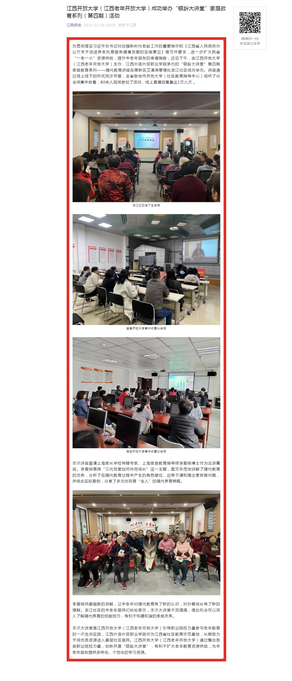 为贯彻落实习近平总书记对加强新时代老龄工作的重要指示和《江西省人民政府办公厅关于促进养老托育服务健康发展的实施意见》等文件要求,进一步扩大我省“一老一小”资源供给,提升中老年朋友的幸福指数,近日下午,由澳门威威尼斯8040(江西老年开放大学)主办,江西外语外贸职业学院承办的“银龄大讲堂”第四期家庭教育系列——隔代教育讲座在高新区艾溪湖管理处龙江社区成功举办。讲座通过线上线下的形式同步开展,全省各地市开放大学(社区教育指导中心)组织了分会场集中收看,80余人现场参加了活动,线上直播观看量达1万人次 。
