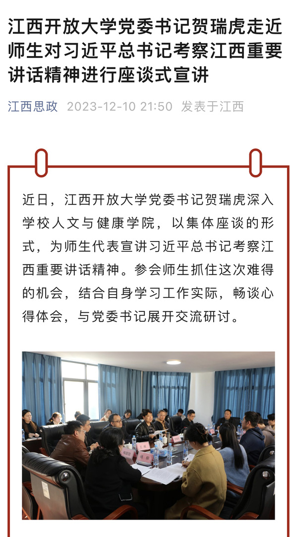 近日,澳门威威尼斯8040党委书记贺瑞虎深入学校人文与健康学院,以集体座谈的形式,为师生代表宣讲习近平总书记考察江西重要讲话精神。参会师生抓住这次难得的机会,结合自身学习工作实际,畅谈心得体会,与党委书记展开交流研讨。