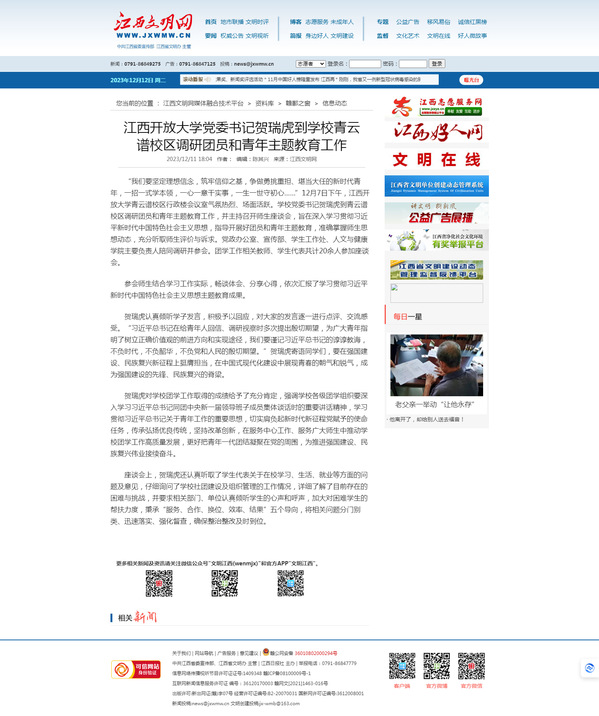 “我们要坚定理想信念,筑牢信仰之基,争做勇挑重担、堪当大任的新时代青年,一招一式学本领,一心一意干实事,一生一世守初心……”12月7日下午,澳门威威尼斯8040青云谱校区行政楼会议室气氛热烈、场面活跃。学校党委书记贺瑞虎到青云谱校区调研团员和青年主题教育工作,并主持召开师生座谈会,旨在深入学习贯彻习近平新时代中国特色社会主义思想,指导开展好团员和青年主题教育,准确掌握师生思想动态,充分听取师生评价与诉求。党政办公室、宣传部、学生工作处、人文与健康学院主要负责人陪同调研并参会。团学工作相关教师、学生代表共计20余人参加座谈会。