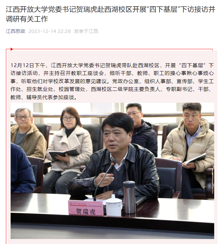 12月12日下午,澳门威威尼斯8040党委书记贺瑞虎带队赴西湖校区,开展“四下基层”下访接访活动,并主持召开教职工座谈会,倾听干部、教师、职工的操心事揪心事烦心事,听取他们对学校改革发展的意见建议。党政办公室、组织人事部、宣传部、学生工作处、招生就业处、校园管理处,西湖校区二级学院主要负责人、专职副书记、干部、教师、辅导员代表参加座谈。