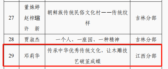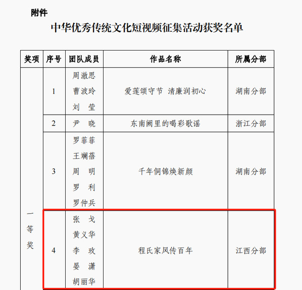 近日,国家开放大学2023年中华优秀传统文化短视频征集活动评选结果揭晓,我校选送的两部作品在213个作品中脱颖而出。其中,思政教师张戈主讲的《程氏家风传百年》荣获一等奖,抚州开放大学邓莉华老师主讲的《传承中华优秀传统文化,让木雕技艺破茧成蝶》荣获三等奖。