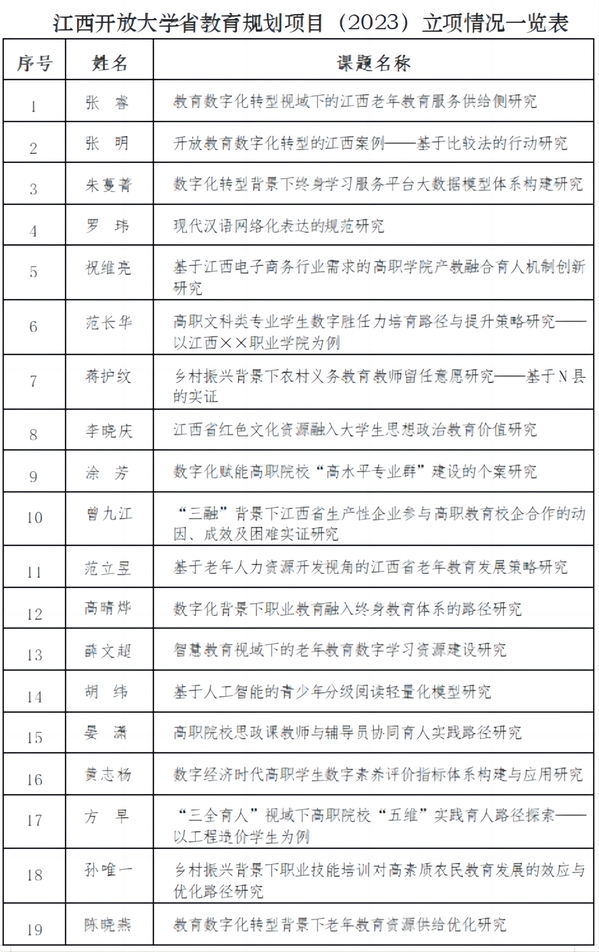 日前,江西省教育科学规划领导小组办公室公布了江西省教育科学“十四五”规划2023年度课题(高职高专系列)评审结果,我校(含江西工程职业学院)共有19项课题获准立项,其中一般课题10项、青年专项9项,立项总数位稳居全省第一。
