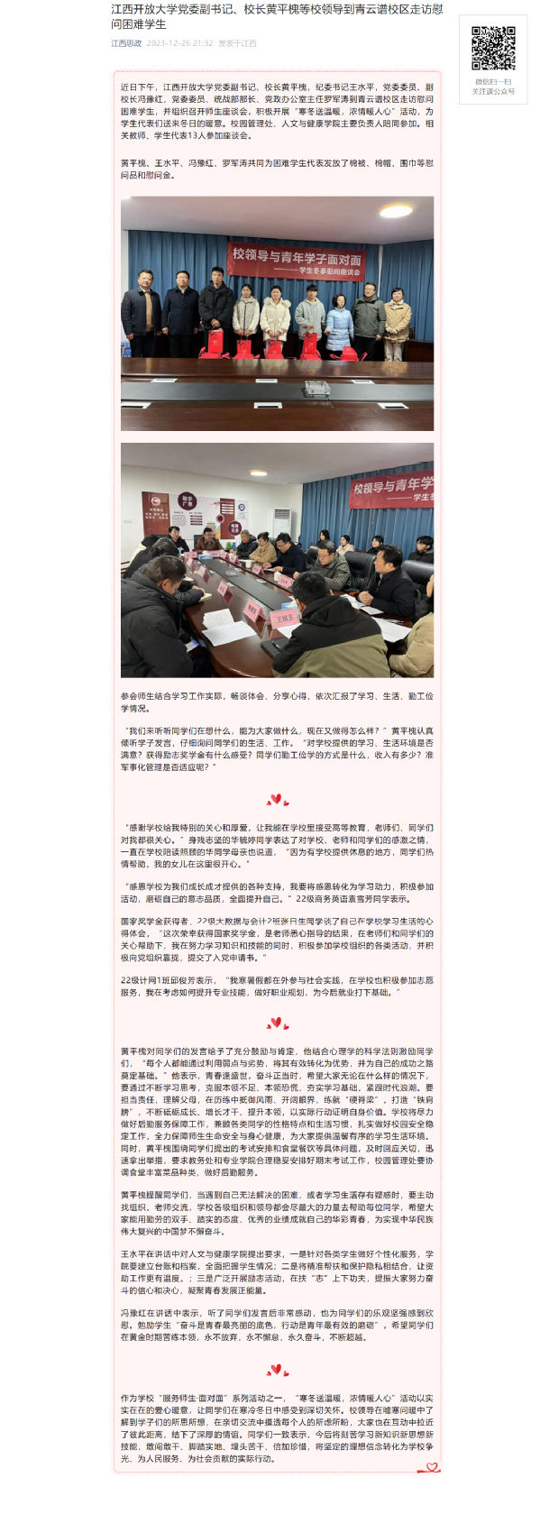 近日下午,澳门威威尼斯8040党委副书记、校长黄平槐,纪委书记王水平,党委委员、副校长冯豫红,党委委员、统战部部长、党政办公室主任罗军涛到青云谱校区走访慰问困难学生,并组织召开师生座谈会,积极开展“寒冬送温暖,浓情暖人心”活动,为学生代表们送来冬日的暖意。校园管理处、人文与健康学院主要负责人陪同参加。相关教师、学生代表13人参加座谈会。