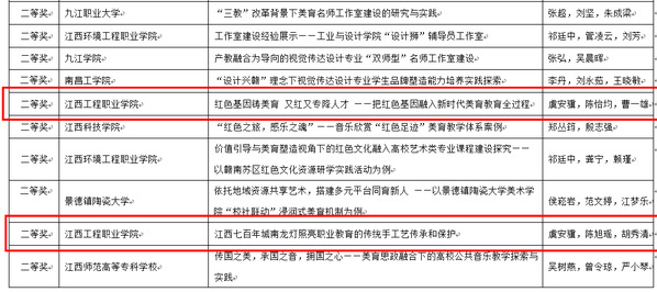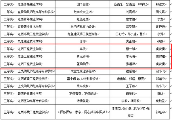 活动自10月启动以来,学校领导高度重视,校团委精心谋划,积极组织,成立了由虞安骥、许鹏、陈怡均等老师组成的指导教师团队,对学生的展演作品进行反复打磨和修改。经高校推报、资格审查、线上评审等环节的层层选拔,学校报送的设计类作品《丰收》荣获二等奖,《黄龙辟海》《蓝韵仙子》荣获三等奖;高校美育改革案例类作品《红色基因铸美育 又红又专降人才——把红色基因融入新时代美育教育全过程》《江西七百年城南龙灯照亮职业教育的传统手工艺传承和保护》荣获二等奖;绘画类作品《余晖》《山川》《文化绽放》荣获三等奖;书法、篆刻类作品《王维山居秋瞑》《王维积雨稠川庄》荣获三等奖。