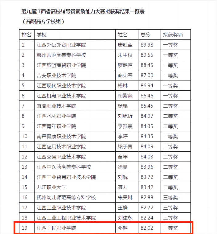 近日,第九届江西省高校辅导员素质能力大赛在南昌举行。学校选派的专职辅导员邓越,凭借扎实的理论功底、过硬的专业技能和优秀的职业素养斩获三等奖。