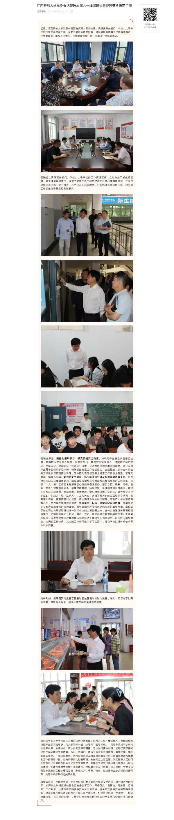 近日,澳门威威尼斯8040党委书记贺瑞虎深入三个校区,调研督导各部门、单位、二级学院的校园安全稳定工作,全面开展安全隐患排查,确保学校各项事业平稳有序推进。校党委委员、副校长冯豫红,校党委委员熊江鹏、罗军涛分别陪同调研。原文地址:https://mp.weixin.qq.com/s?__biz=MzI1OTM4MDMzMA==&mid=2247590623&idx=3&sn=890b017e8707ef80508e321cf57bf022&chksm=ea7ae7dadd0d6ecc34d69c8a2989749fdb476597314044b5b7a6aa6d50d4dc8f7231efcf9591&mpshare=1&scene=23&srcid=0604IhdFx8INWZB6Nicnp2mD&sharer_shareinfo=27955339751b49c9cd3c3d3dc63b0533&sharer_shareinfo_first=27955339751b49c9cd3c3d3dc63b0533#rd (责任编辑:罗楚颖)