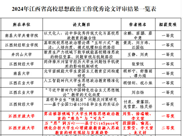 近日,江西省教育厅公布了2024年度全省高校思想政治工作优秀论文和优秀案例征集活动的评选结果。学校报送的思政论文《算法推荐视域下大学生网络思想政治教育的“难为”与“可为”》《万“思”润万心——基于CiteSpace可视化分析大学生心理健康教育融入思政教育的研究现状与发展趋势》分别荣获优秀论文一等奖、二等奖,思政案例《红色的精神跨越时空伟大的事业薪火相传——高等学历继续教育“红色资源+”立德树人探索与实践》荣获优秀案例二等奖。