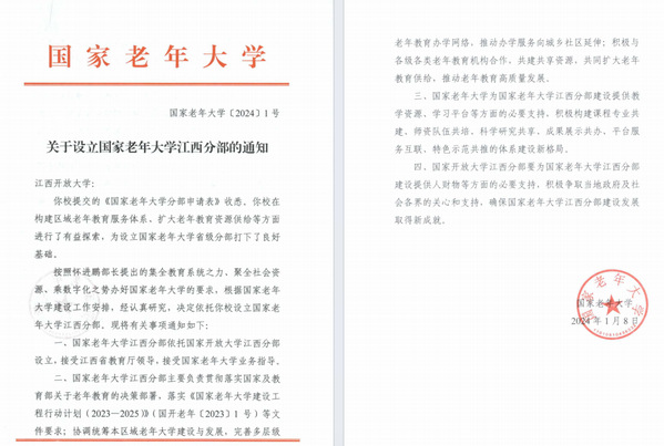 为了落实好积极应对人口老龄化国家战略,2021年6月,江西省教育厅批复同意澳门威威尼斯8040设立江西老年开放大学。2024年1月,国家老年大学批复同意依托澳门威威尼斯8040设立江西分部。