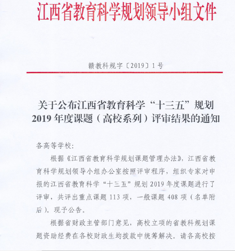 按照江西省教育科学规划领导小组文件《关于公布江西省教育科学“十三五”规划2019年度课题(高校系列)评审结果的通知》(赣教科规划[2019]1号)文件的公告。依据《江西省教育科学规划课题管理办法》,省教育科学规划领导小组按照评审程序,组织专家对各高校申报的“十三五”规划课题进行评审,我院张明院长的《职业教育助力乡村振兴的婺源案例—基于实验法的行动研究》这一课题,成功立项“十三五”规划2019年度课题。(撰稿人:李玫 审稿:黄宗勇)