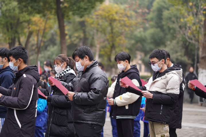 学生代表诵读《南京!三十万!》,深切哀悼南京大屠杀遇难同胞。青年学子共同宣读《和平宣言》,以青春之名庄严宣誓“铭记历史,勿忘国耻,发愤图强,耀我中华!”