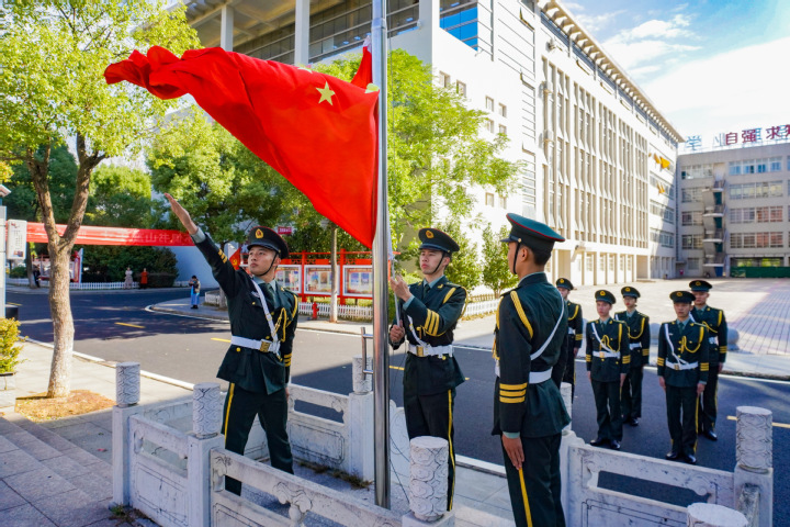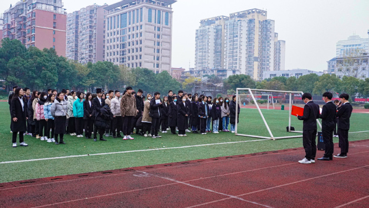 首先,在学校操场举行国家公祭日主题升旗仪式,护旗手们迈着铿锵的步伐护送国旗到国旗台,在雄壮的国歌中,五星红旗冉冉升起。升旗仪式后,全体师生向死难者默哀,表达对南京大屠杀死难者的哀思。