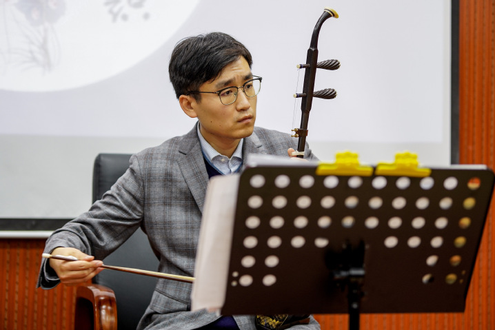 张子强老师从二胡的发展历史、民族韵味和主要艺术特点三个方面进行了生动的教学讲解,同时还现场演奏了《二泉映月》、《秦腔主题随想曲》、《一枝花》、《良宵》、《赛马》、《阳光照耀着塔什库尔干》等经典名曲片段。为现场师生呈现了一场精彩的听觉盛宴。