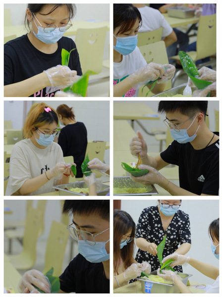 活动伊始,食堂工作人员精心准备了包粽子所需要的材料,购买了粽叶、糯米、蜜枣等,为使同学们过上一个有意义的节日做好了充足的准备。活动中,同学们舞动粽叶,手指穿梭,纷纷拿出看家本领,青绿的粽叶、雪白的糯米在大家手中瞬间便包成了一个个可爱的粽子。不一会儿,桌子上便摆满了形态各异的粽子。期间,杨近铬书记来到学生身边,与大家一起动手,包制美味可口的粽子,现场欢声笑语、其乐融融。