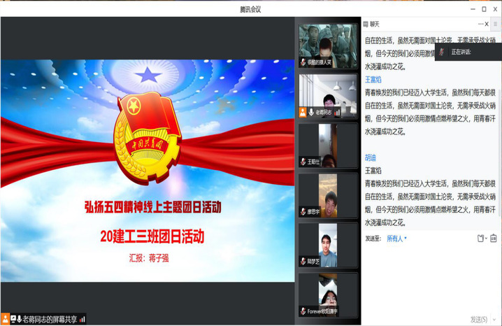 各团支部书记组织团员青年开展“五四”青年节主题团日活动,线上以腾讯会议的形式,带领团员青年们学习党领导中国青年运动的关辉历程和先进青年的光辉事迹。线下,带领团员青年重温入团仪式,开展我和团旗团徽合个影等活动。