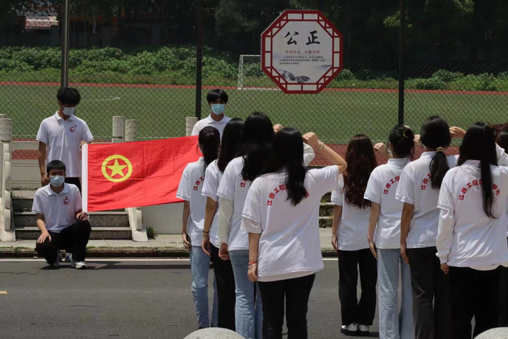 团员青年面向鲜艳的团旗,举起右手庄严宣誓。一句句铿锵有力的入团誓言,提醒着每位青年团员不忘入团初心,牢记青春使命。