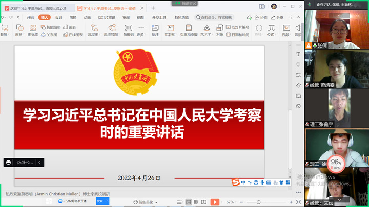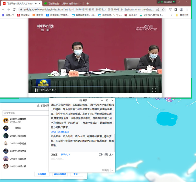 4月26日,学院团委以腾讯会议形式,组织各分院各年级共70余名学生代表召开习近平总书记在中国人民大学考察时的重要讲话专题学习会。