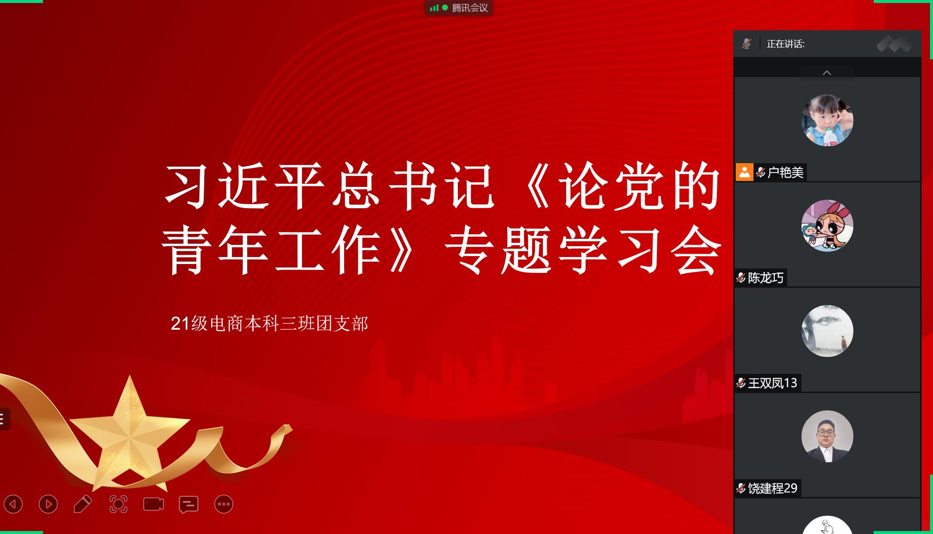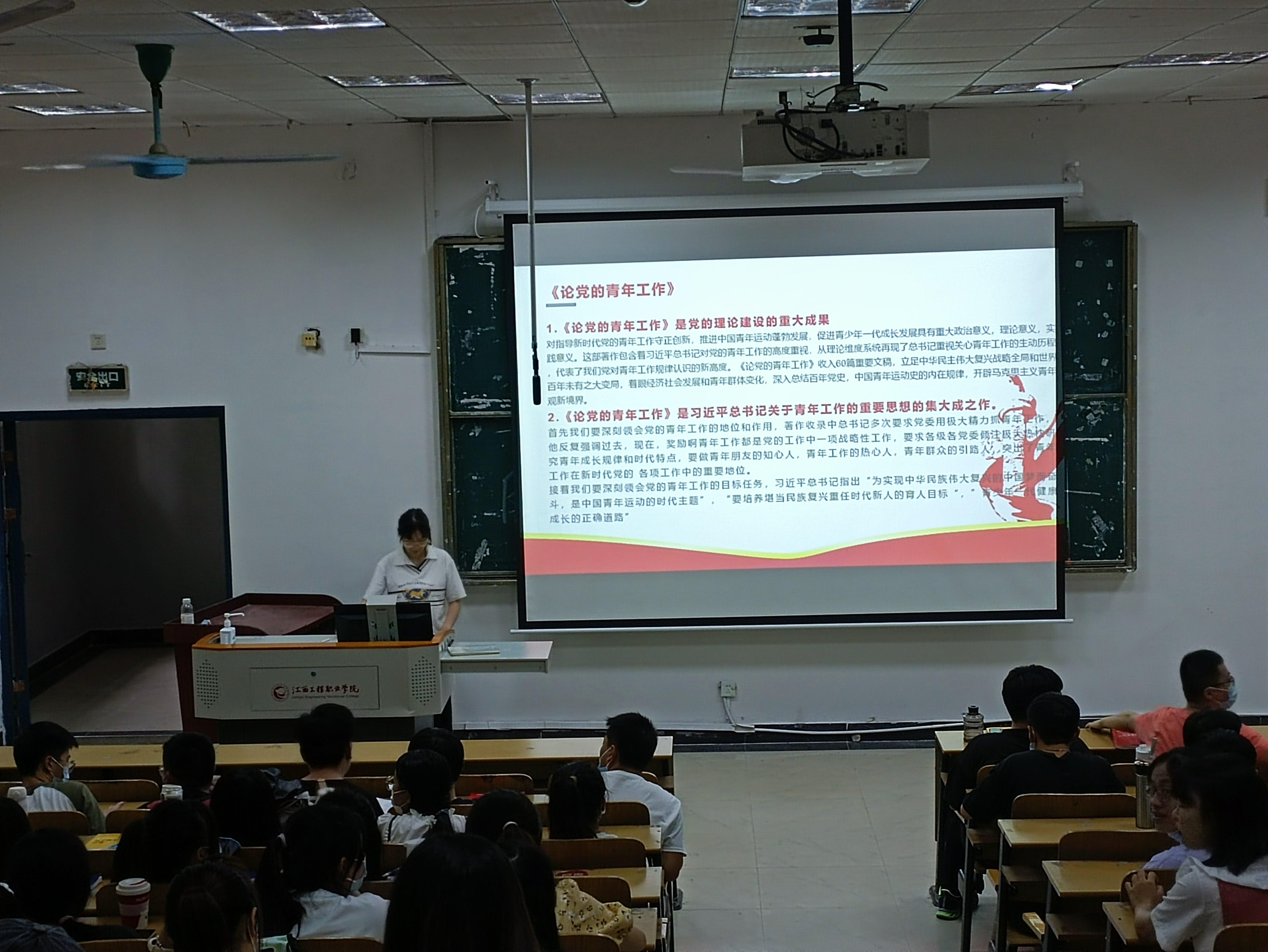 为深入学习领会习近平总书记关于青年工作的重要论述,深化“喜迎二十大、永远跟党走、奋进新征程”主题教育实践,学院团委组织全体团支部积极开展《论党的青年工作》专题学习活动。各团支部以线上或线下的形式开展专题学习,分享学习心得,实现理论学习团支部全覆盖。