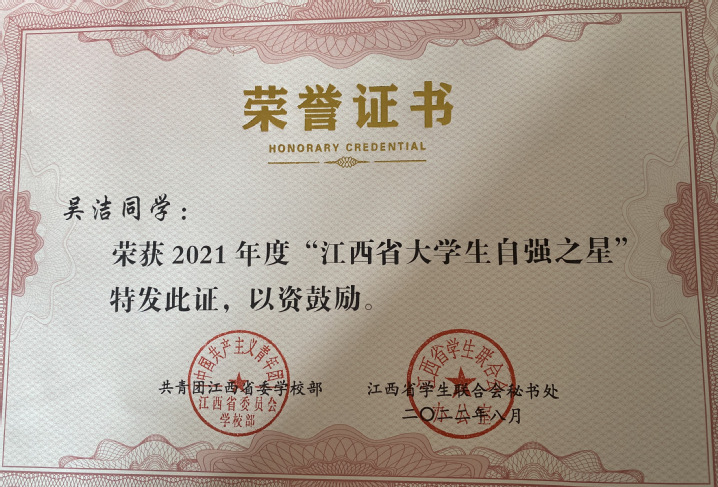 近日,根据“自强之星”推报工作要求,经学院推荐,团省委和省学生联合会审评,我院经管学院21级电子商务本科1班吴洁同学被授予2021年度“江西省大学生自强之星”荣誉称号。