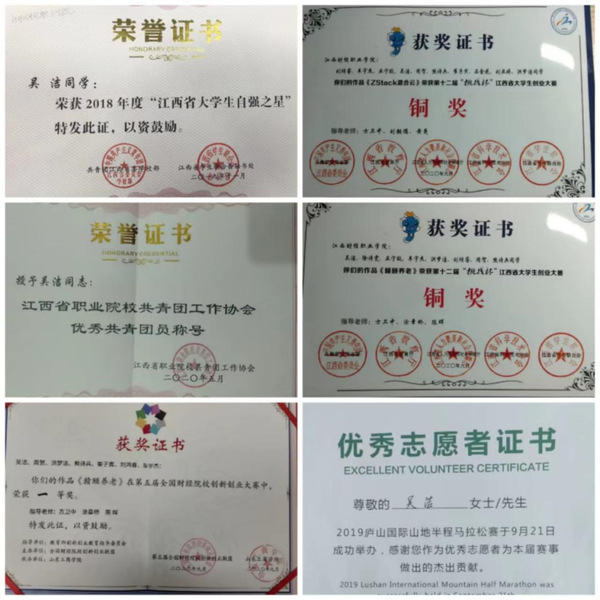 她说:“创业注重创新,创新就是要有好点子,没有好点子,做出来的事都是平淡无奇,惊不起波澜的。”在专科学习阶段,吴洁就积极学习,不断创新,在参与老师的混合云项目期间,学习到了许多创业的方法。当她了解到大数据对当今社会的影响时,就将大数据和老龄化联系起来,通过不断的调研和构思,她开始作为主项目人创建了赣颐养老项目,利用信息化手段及互联网和物联网等高新技术,打造养老物联网信息平台,并积极参与创业比赛,找出不足,吸收意见,积极改进,最终荣获了“第五届全国财经院校创新创业”一等奖,“第十二届挑战杯江西省大学生创业大赛”铜奖。