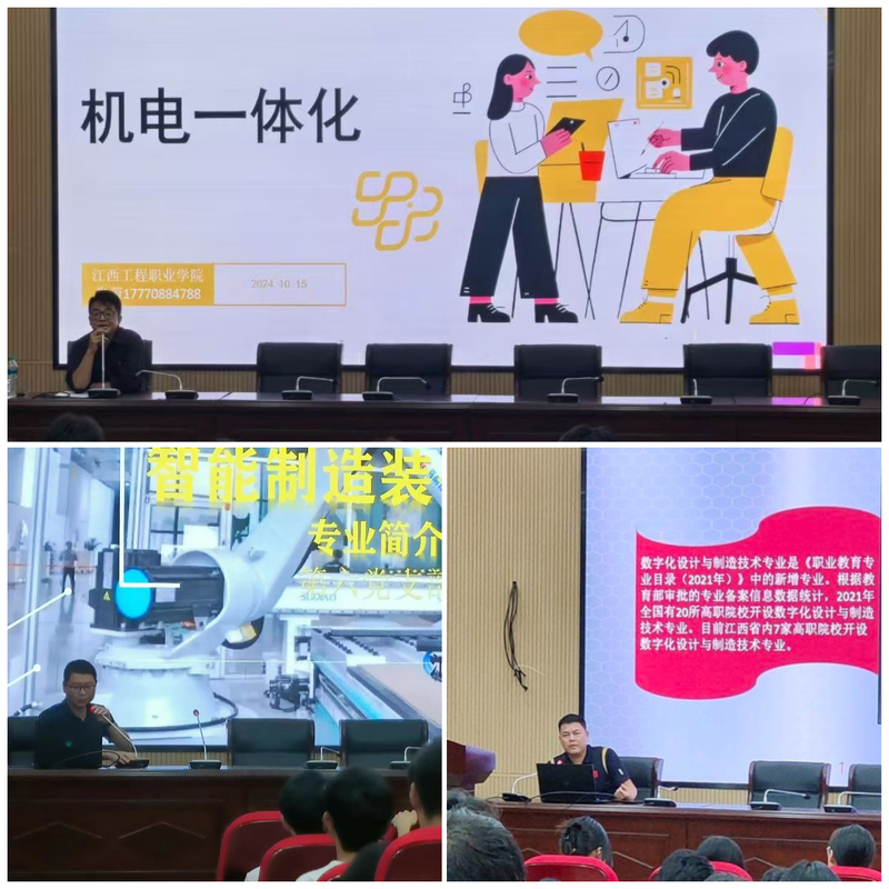 本次讲座内容丰富,实用性强,富有启发性和教育意义。教务科副科长罗德华以数字化专业技术的就业方向为主线,向新生详细介绍了新兴制造行业和新兴技术的概念及各项成果,并对数字化设计制造专业的发展方向进行了展望。党员教师卢舟洲从专业介绍、主干课以及就业前景三个方面向环境艺术专业的新生进行了专业内容的展示和讲解。党员教师龙生海给工程测量专业新生详细描述工程测量在各类工程中的实际应用,介绍了工程测量中常用的仪器和设备,并展示了工程测量成功的部分案例,增强了新生的直观感受。通过对专业整体情况、专业教学内容,以及未来三年学习规划等方面作为切入点,党员教师彭勃对现阶段新能源汽车的发展趋势,人才需求等方面给新生进行讲解。党员教师朱蔚教师从专业概况、行业情况、培养目标、课程体系、发展方向等多个方面,详细地介绍了机电一体化的课程、实训条件、师资力量、实习就业、校企合作单位等情况。党员教师谢新辉向智能制造装备技术新生们展示科技的魅力和力量,他通过一系列生动的实验和案例,让学生们深刻认识到智能制造专业在现代制造领域的重要性,同时呼吁同学们扎实学好专业知识,提高个人素质,为实现中国式现代化贡献青春力量。