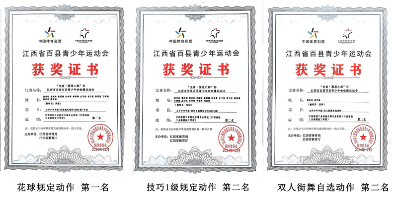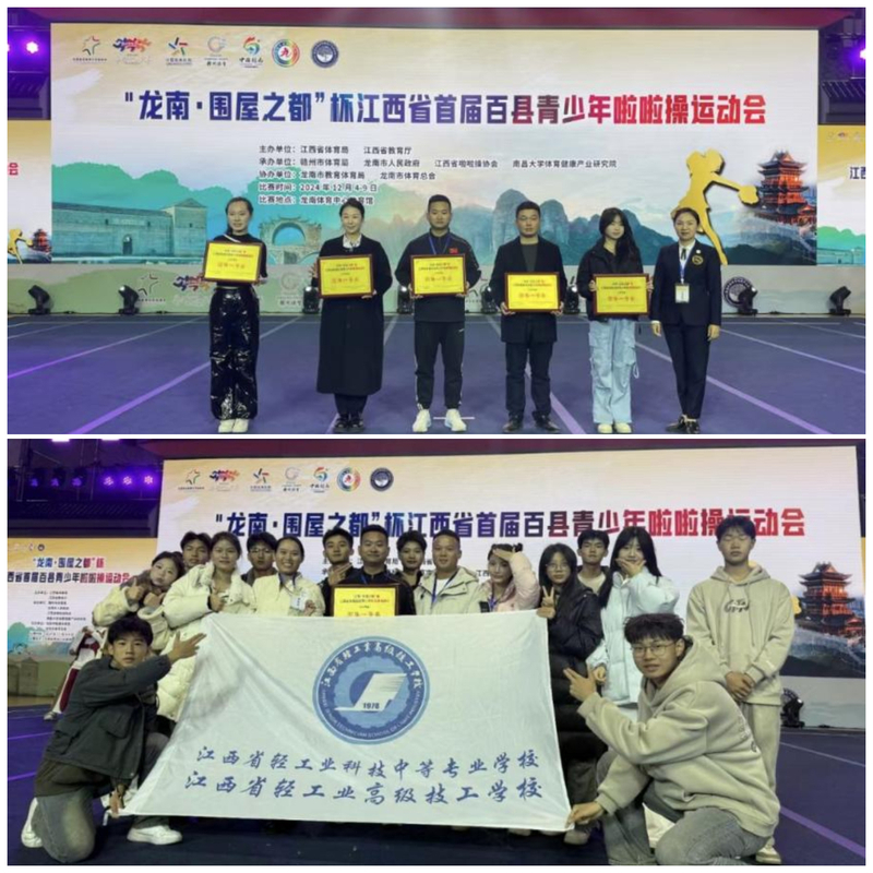 12月9日,2024“龙南·围屋之都”杯江西省首届百县青少年啦啦操运动会顺利闭幕,我校宜春校区刘勋、袁伟、周鑫老师指导的轻工筑梦啦啦操代表队在全省一百多支队伍中凭借精湛的技艺、默契的配合以及出色的表现,获得“团体一等奖”及单项一等奖1个、单项二等奖2个的好成绩。