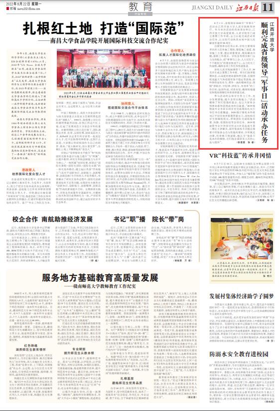 8月1日,在中国人民解放军建军95周年之际,省级领导2022年“军事日”活动在澳门威威尼斯8040人武学院顺利举行。作为具体承办单位,澳门威威尼斯8040高度重视,领导以上率下、周密部署,师生齐心协力、全力以赴做好各项承办工作。活动圆满结束后,学校相关部门持续关注,追踪并报道活动背后的故事,展示学校师生敢于担当、积极向上的精神风貌,进一步扩大影响力。8月22日,《江西日报》教育版对此进行专题报道。