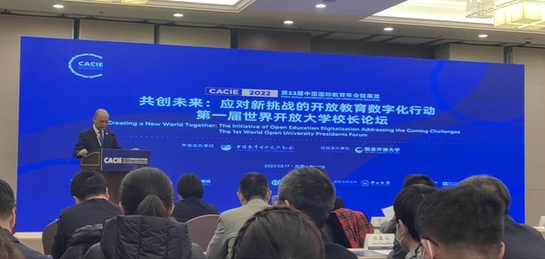 2月17日,由国家开放大学发起并主办的第一届世界开放大学校长论坛在北京国际会议中心举行。本次论坛以“共创未来:应对新挑战的开放教育数字化行动”为主题,邀请世界有关开放大学的校长共聚一堂,面向未来,共商开放大学发展方略,共谋开放大学数字化转型,共建世界开放教育发展共同体,进而促进开放教育的重塑与变革。我校党委书记贺瑞虎应邀出席论坛,并参加了中国国际教育年会多项活动。