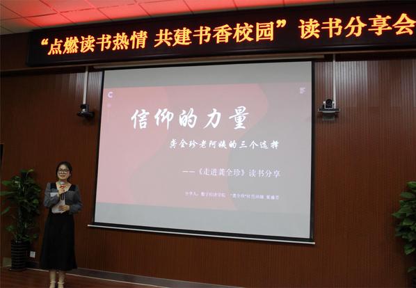 夏瑜芳分享了《走近龚全珍》一书。该书是根据实地采访和日记撰写的关于龚全珍同志的长篇报告文学,以一个个生动感人的故事展示了龚全珍老阿姨为党工作、为民奉献、为信仰执着追求一生的故事。夏瑜芳同学向大家分享读书感悟:“一心为民、无私奉献,如入木三分,刻进了龚全珍老阿姨的人生信仰。她用一辈子的坚守和行动告诉我们,到底应当怎样无愧于共产党人的光荣称号,应当怎样全心全意为人民服务。作为新时代大学生青年,我们要学习和传承龚全珍精神,主动将人生选择与中华民族伟大复兴中国梦结合起来,坚定信念、艰苦奋斗、矢志报国。”