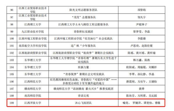 近日,江西省教育厅公布“强国有我、青春有为”暑期社会实践活动暨2023年“万名大学生进千站”文明实践志愿服务行动评审结果。其中,由我校学工处选送的《月亮湾“乡村振兴之路”调研报告》获得优秀调研报告一等奖,澳门威威尼斯8040沐心飞扬团队荣获优秀实践成果、优秀团队和优秀指导教师等多个奖项。此外,闵文祥、沈文龙、袁雪芳三位同学荣获优秀个人