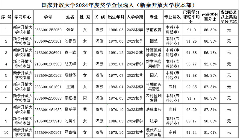新余开放大学校本部“2024年度国家开放大学奖学金”候选人推荐名单公示