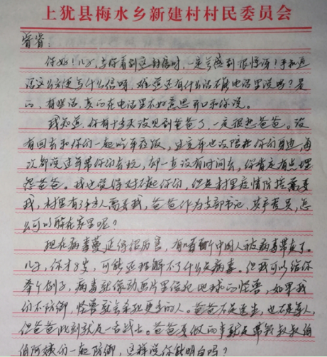 “儿子,我知道,你有十多天没见到爸爸了,一定很想爸爸。”“村里疫情需要我,爸爸作为村党支部书记,一名共产党员,怎么可以躲在家里呢?”“爸爸不是医生,也不是军人,但爸爸此刻就是一名战士。爸爸要做的事就是带领叔叔伯伯阿姨们一起防御……”2月5日,我校赣州电大上犹党校18春行政管理本科学员、上犹县梅水乡新建村党支部书记田克远在防疫工作间隙,给儿子写了一封特殊的家书。