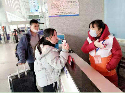疫情下的春运,任重道远。罗雪金毅然来到抚州火车站为旅客提供志愿服务。她带领着义工同仁们为来往旅客提供咨询、指引、测量体温、护送老弱病残、寻人寻物、搬运行李、语言翻译、简单医疗救护及预约等服务,积极配合各部门开展各项工作。