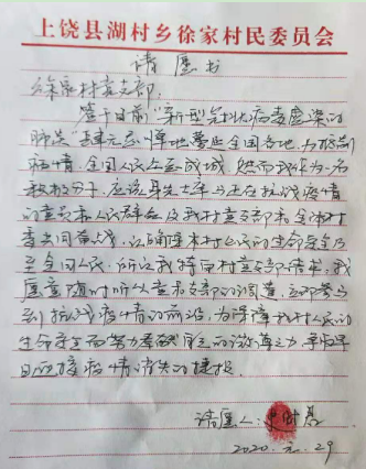 疫情当前,闻令而动,“我作为一名积极分子,应该身先士卒与正在抗战疫情的党员、人民群众及我村党支部、全体村委共同奋战……。”史财君主动向村党支部递交了请愿书,要求参与疫情防控工作。防疫工作中,他坚持做好村头路口卡点的安全值守,对重点车辆逢车必检、逢人必查,检测体温、车辆消毒、劝返。